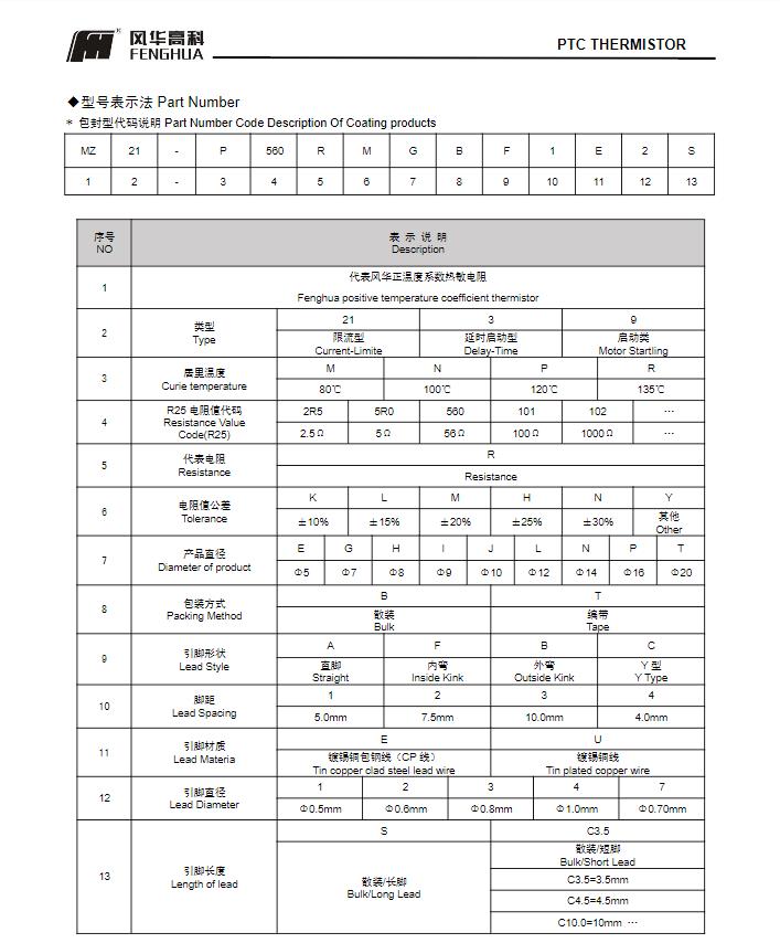 風華高科PTC熱敏電阻命名規則: