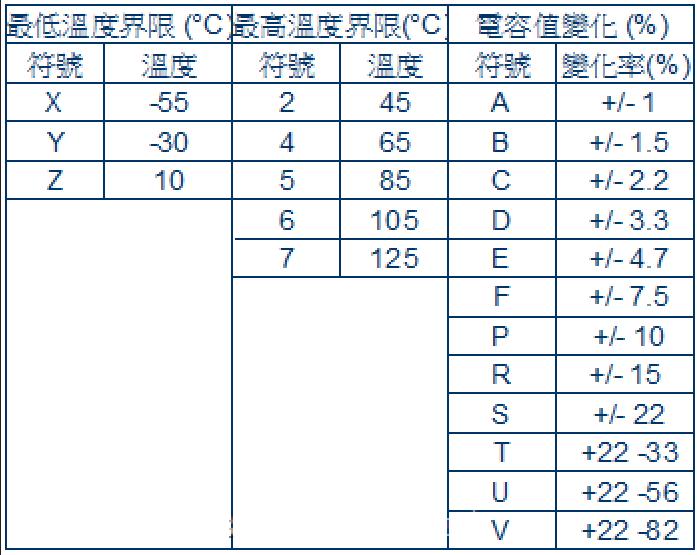 Y5V : 表示-30°C(Y) ~到 85°C(5) 其容量變化(以25°C為基準)必須在+22~82%(V)以內。