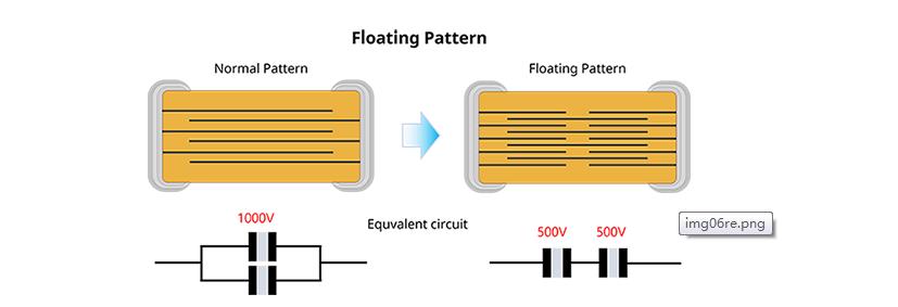 Floating設計雖然是在MLCC 發生Crack時,能夠降低短路風險的結構,但是在高電壓下也是非常有用的結構。Floating 結構在MLCC內部將電壓按一半分配。例如在MLCC兩端施加1000V電壓時,利用Floating設計可將MLCC電介質內部的電壓降低到1000V的一半,也就是500V。因為MLCC的壽命由溫度和電壓決定,而施加在MLCC電介質上的Electric field變弱,所以在可靠性方面便有了優勢。