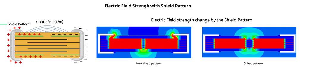 高壓MLCC結構與一般MLCC 相比有何不同呢?在高電壓環境下需要確??煽啃?。暴露在高壓環境下的MLCC有Arc-ove的危險,MLCC內部存在短路的危險。當向MLCC施加高電壓時,MLCC周圍會形成強電場(Electric field),進而產生ionized air。尤其是在MLCC端電極部位集中了大的電場(Electric field)。如果在Ionized air中超過了啟動電壓(inception voltage)就會發生電 Arc,MLCC 內部就會有發生circuit short 的危險。防止這種現象產生的結構是shield pattern。