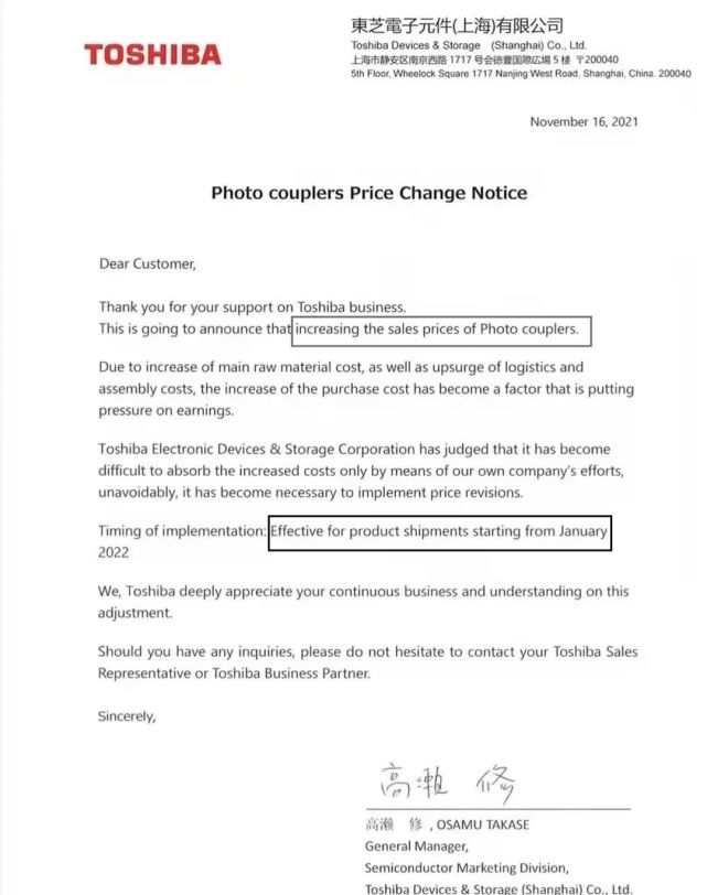 東芝發布漲價函,2022年1月正式調漲近日,業內人士表示東芝將于2022年對部分產品進行調漲,并附有一封英文漲價函。該漲價函顯示,11月16日,東芝向客戶表示,光電耦合器將于2022年1月開始正式漲價。對于漲價原因,東芝表示,由于原材料、物流和其他供應鏈價格不斷上漲,公司在盈利方面的壓力越來越大。東芝電子元件有限公司已經無法自行消化越來越大的成本,因此,東芝不得不做出漲價的決定。光耦合器為電源開關